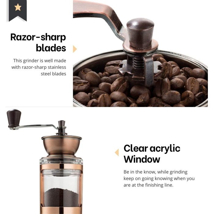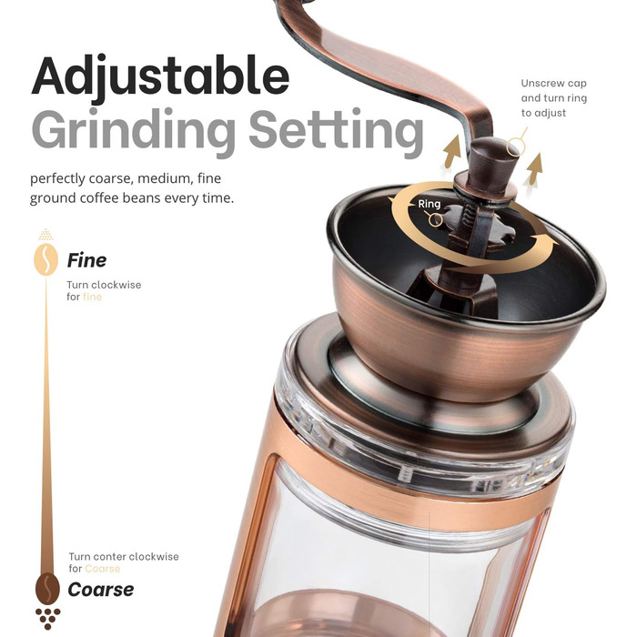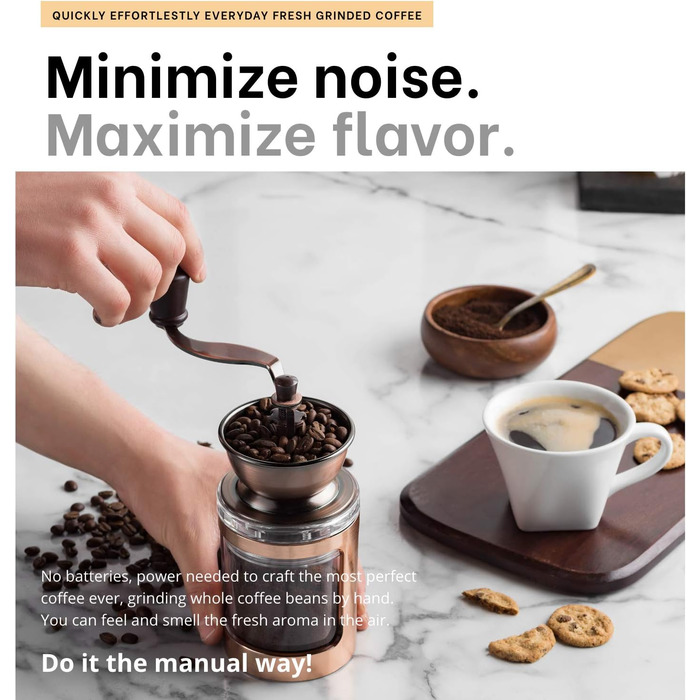 - Насолоджуйтесь свіжозмеленими кавовими зернами де б ви не були: ця ручна кавомолка чудова, адже вона портативна, безшумна та генерує значно менше тепла, ніж звичайні електричні кавомолки, що дозволяє вам отримати більш ароматну та насичену чашку кави.